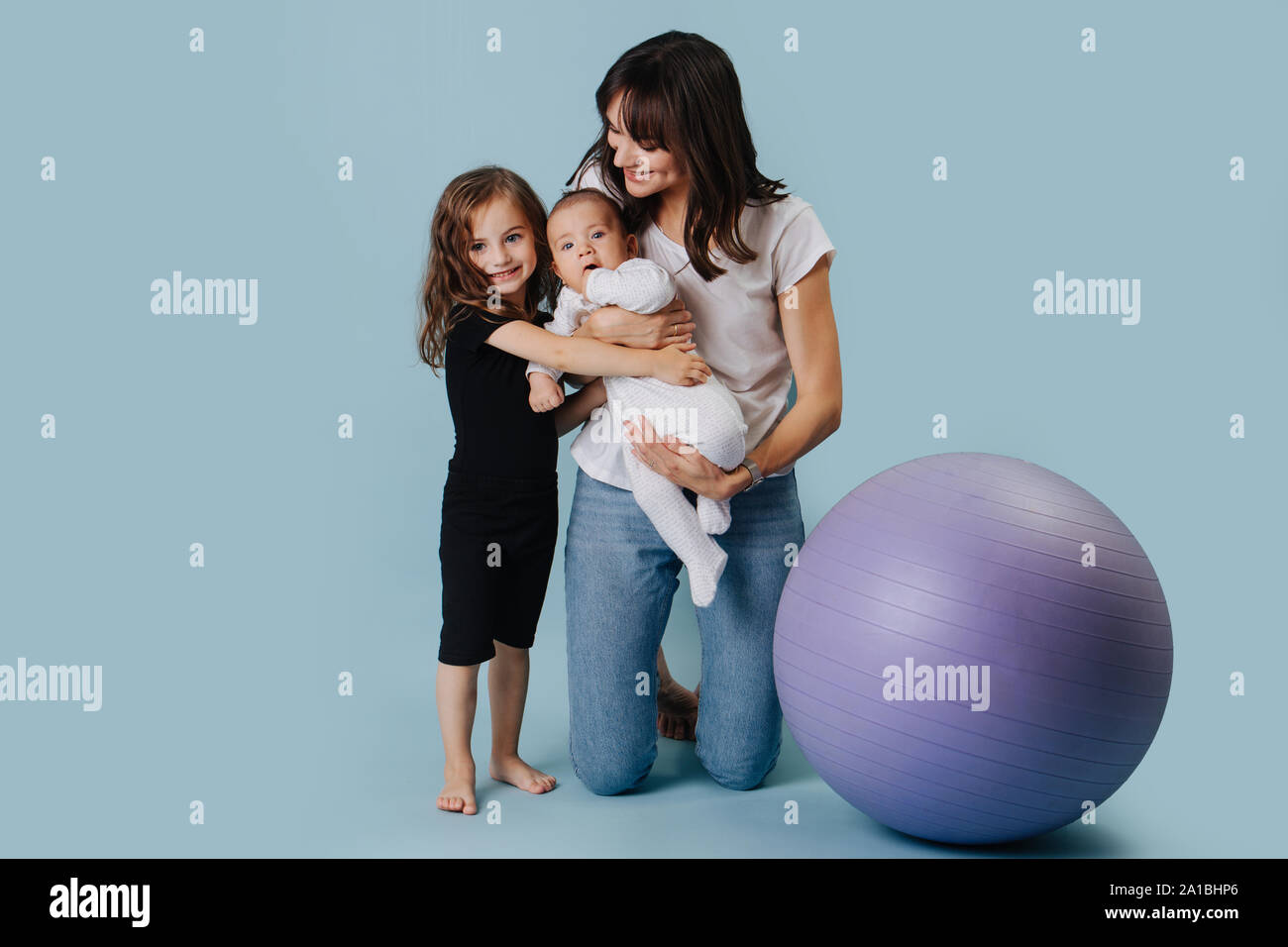 Family Portrait Of A Mother With Two Daughters Next To A Yoga Ball Over Blue Stock Photo Alamy